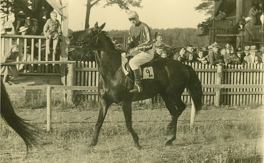 | Nr. inwentarzowy: MŁJ-XVI 1760 / 00 / 036 opis: Tor wyścigów konnych, Bieg na przełaj im. Szefa Departamentu Kawalerii pułkownika Piotra Skuratowicza. Rtm. Michał Bohdanowicz stępuje na spoconym i zdenerwowanym koniu Równy. Jeździec w stroju wyścigowym (własne barwy), koń ma na potniku numer 2. Z przodu ogon innego konia, w tle ogrodzenia, fragmenty trybun, publiczność.data: czerwiec 1937 r.czas powstania - daty graniczne: 1937-06-01 - 1937-06-30miejsce: Wilno, Pośpieszkaosoby: Rtm. Michał Bohdanowicz 1903-48 (syn Jana Bohdanowicza i Marii z Cywińskich, brat Heleny i Krystyny, mąż Wandy z domu Leskiej. W latach 1932-36 i przed II wojną w 4 Pułku Ułanów Zaniemeńskich, od 1936 w 13 Pułku Ułanów Wileńskich; nazywany "Misiem". Podczas kampanii wrześniowej trafił do niewoli, zmarł niedługo po powrocie z oflagu).tworzywo: papier fotograficzny, półmatowytechnika: odbitka żelatynowo-srebrowa DOP, tonowana?zespół: album rodziny Bohdanowiczówwymiary (wys. x szer.): 83 x 132 [mm] Koń: 1. Równy, wałach, rasa: półkrwi, maść skarogniada - po Konwent i Powaga, hod. St. Ciemniewski, wł. rtm. K. Choroszewski. Startowali na nim w biegach na przełaj i steeple-chase M. Bohdanowicz i wł. Żelewski