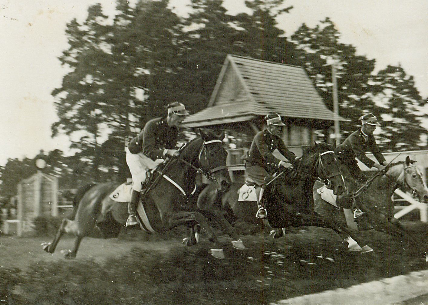 | Nr. inwentarzowy: MŁJ-XVI 1758 / 00 / 105 opis: Tor wyścigów konnych, Wojskowy bieg na przełaj. Trzy konie z jeźdźcami skaczą równocześnie przez żywopłot z rowem. Grupa znajduje się na wysokości celownika i trybuny sędziowskiej, ale na wewnętrznej bieżni. Jeźdźcy w mundurach (jeden w białych bryczesach. Najdalszy koń siwy, pozostałe ciemnej maści, środkowy z odmianami na głowie i nogach.czas powstania - daty graniczne: 1935-06-30 - 1935-07-21miejsce: Wilno, Pośpieszkatworzywo: papier fotograficzny, błyszczącytechnika: odbitka żelatynowo-srebrowa DOP, czarno-białazespół: album rodziny Bohdanowiczówwymiary (wys. x szer.): 60 x 81 [mm]