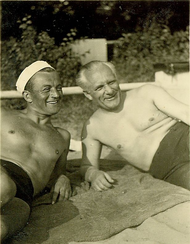 | Nr. inwentarzowy: MŁJ-XVI 1760 / 00 / 032 opis: Na piasku, na brzegu koca lub obszernego szlafroka leżą kpt. pil. Eugeniusz Makowski.(w kąpielówkach i marynarskiej czapeczce) oraz ppłk Juliusz Gilewicz (w kąpielówkach). W kadrze część sylwetek. W tle ogrodzenia plaży, zieleń.data: czerwiec 1937 r.czas powstania - daty graniczne: 1937-06-01 - 1937-06-30miejsce: Toruńosoby: Kpt. pil. Eugeniusz Makowski, 1905-38 zginął w czasie Zawodów Szybowcowych w Masłowie (4 p.lot., d-ca 143 Eskadry Myśliw.); Ppłk lotn. Juliusz Gilewicz 1890-1943 rozstrzelany w Auschwitz (poliglota, pilot w w wojsku sowieckim, z częścią oddziału przyłączył się do WP i wziął udział w wojnie 1920 r. Później komendant parku w 4 p.lot. w Toruniu, w 1937 przeniesiony w stan spoczynku, praca w PLL „LOT”. II wojna: ZWZ, aresztowany w 1942, w KL Auschwitz w konspiracji wojskowej utworzonej przez rtm. Pileckiego.tworzywo: papier fotograficzny, błyszczącytechnika: odbitka żelatynowo-srebrowa DOP, tonowana?zespół: album rodziny Bohdanowiczówwymiary (wys. x szer.): 61 x 47 [mm]