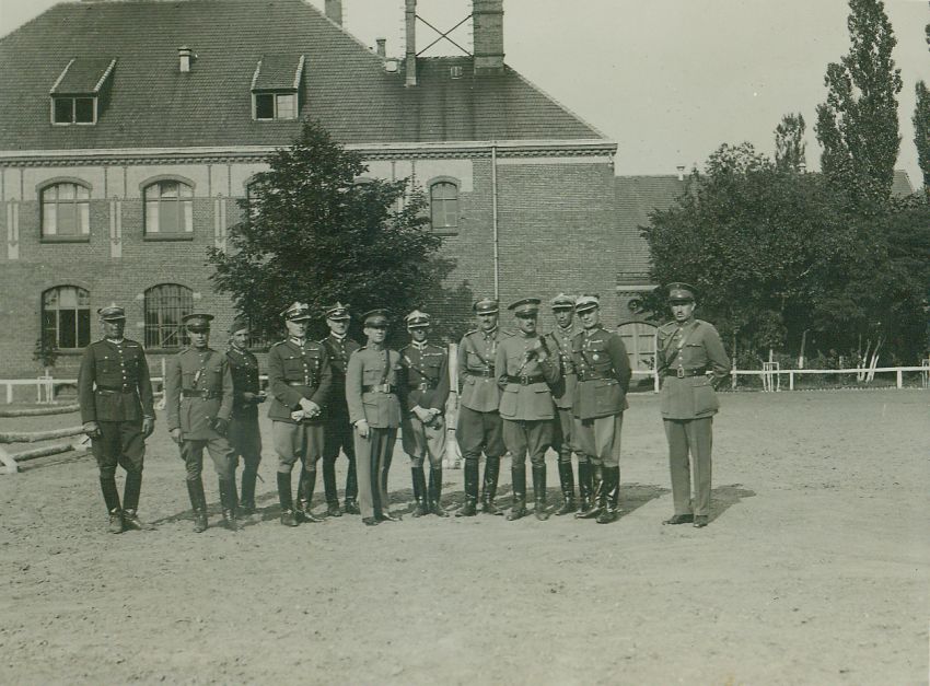 opis: plac - ujeżdżalnia w C.W.K.; 11 oficerów na tle budynku