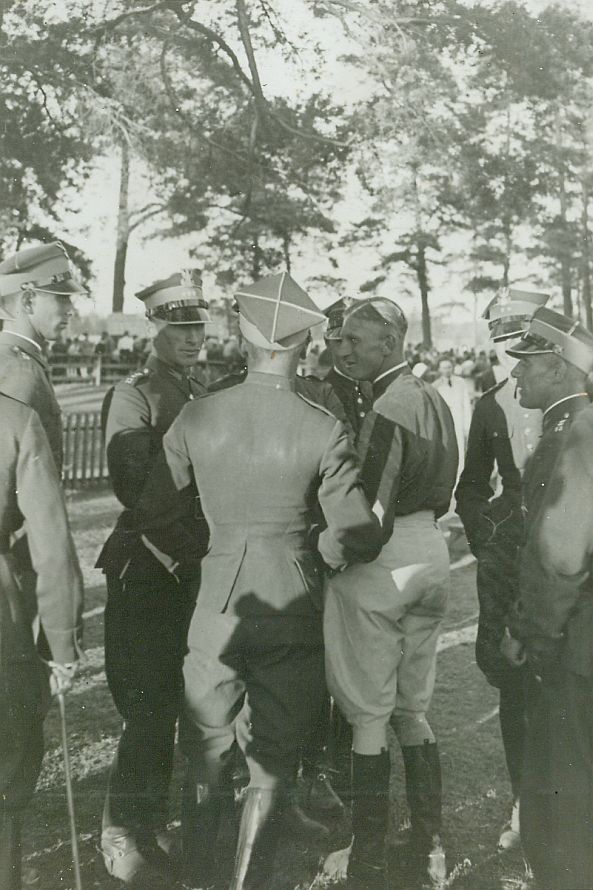 | Nr. inwentarzowy: MŁJ-XVI 1746 / 00 / 017 opis: Tor wyścigów konnych, Po Steeple-chase im. Pana Ministra Władysława Raczkiewicza. Michał Bohdanowicz (jasne bryczesy, ciemna kurtka z jasnymi pasami na rękawach) stoi w towarzystwie innych oficerów w mundurach, prawdopodobnie kolegów z pułku. W tle kilka drzew.czas powstania - daty graniczne: 1936-06-28 - 1936-06-28miejsce: Wilno, Pośpieszka.osoby: Rtm. Michał Bohdanowicz "Miś" (1903-1948), 13 p.u., dowódca 1 szwadronu "Tatarskiego".tworzywo: papier fotograficzny, błyszczącytechnika: odbitka żelatynowo-srebrowa DOP, czarno-białazespół: album rodziny Leskichwymiary (wys. x szer.): 126 x 86 [mm]