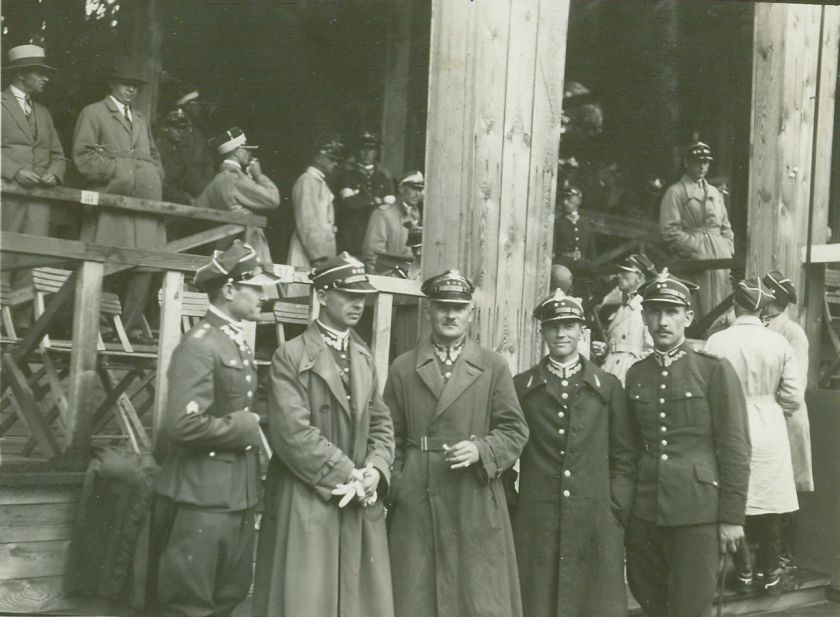 | Nr. inwentarzowy: MŁJ-XVI 1743 / 00 / 054 opis: Drewniana trybuna, na niej i przed nią stoi kilkunastu mężczyzn, gł. oficerów. Z przodu zwycięska ekipa 15 p.u.: por. P. Piniński, rtm. J. Kapuściński, płk R. Dreszer, por. Wł. Zgorzelski (2 m. ind.), por. J. Brodzki (1 m. ind.). Kapuściński i Dreszer w płaszczach bez dystynkcji, Zgorzelski w płaszczu mundurowym.czas powstania - daty graniczne: 1930-07-01 - 1930-07-31miejsce: Warszawa, Łazienki, hipodromosoby: oficerowie 15 p.u., od lewej: por. Piotr Piniński (1902-1940), rtm. Janusz Kapuściński (1898 - 1998), płk Rudolf Dreszer (1891-1958) dowódca pułku, por. Władysław Zgorzelski (1901-1998), por. Jan Brodzki (1902-1980)tworzywo: papier fotograficzny, błyszczącytechnika: odbitka żelatynowo-srebrowa DOP, czarno-białazespół: album rodziny Leskichwymiary (wys. x szer.): 87 x 115 [mm]