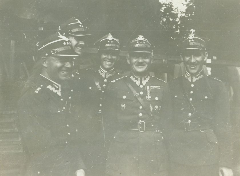 | Nr. inwentarzowy: MŁJ-XVI 1743 / 00 / 055 opis: Przed drewnianą trybuną oficerowie zwycięskiego zespołu 15 p.u.: rtm. J. Kapuściński, por. P. Piniński, por. Wł. Zgorzelski, płk R. Dreszer, por. J. Brodzki. Wszyscy się uśmiechają, widać górną część sylwetek.czas powstania - daty graniczne: 1930-07-01 - 1930-07-31miejsce: Warszawa, Łazienki, hipodrom.osoby: oficerowie 15 p.u., od lewej: rtm. Janusz Kapuściński (1898 - 1998), por. Piotr Piniński (1902-1940), por. Władysław Zgorzelski (1901-1998), płk Rudolf Dreszer (1891-1958) dowódca pułku, por. Jan Brodzki (1902-1980)tworzywo: papier fotograficzny, błyszczącytechnika: odbitka żelatynowo-srebrowa DOP, czarno-białazespół: album rodziny Leskichwymiary (wys. x szer.): 87 x 114 [mm]