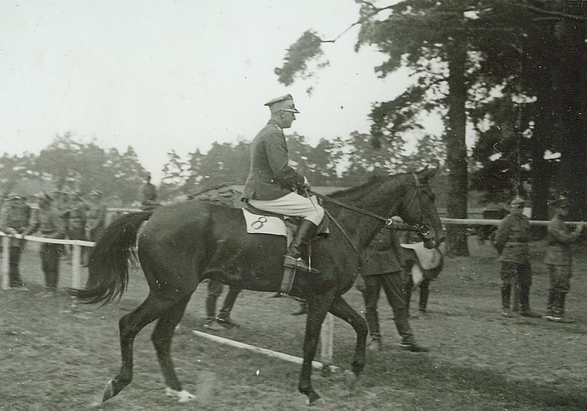 | Nr. inwentarzowy: MŁJ-XVI 1746 / 00 / 102 opis: Tor wyścigów konnych, bieg na przełaj im. Antoniego Alexandrowicza (1870-1930). Michał Bohdanowicze na koniu Życzliwy wraca kłusem do wagi po wygraniu wyścigu. Jeździec w mundurze, białe bryczesy. Na potniku nr 6. Przy ogrodzeniu stoją wojskowi, w tle drzewa.czas powstania - daty graniczne: 1936-07-16 - 1936-07-16miejsce: Wilno, Pośpieszka.osoby: Rtm. Michał Bohdanowicz "Miś" (1903-1948), 13 p.u., dowódca 1 szwadronu "Tatarskiego".tworzywo: papier fotograficzny, błyszczącytechnika: odbitka żelatynowo-srebrowa DOP, czarno-białazespół: album rodziny Leskichwymiary (wys. x szer.): 83 x 116 [mm] Koń: 1. Życzliwy - koń, na którym rtm. M. Bohdanowicz startował w biegach na przełaj