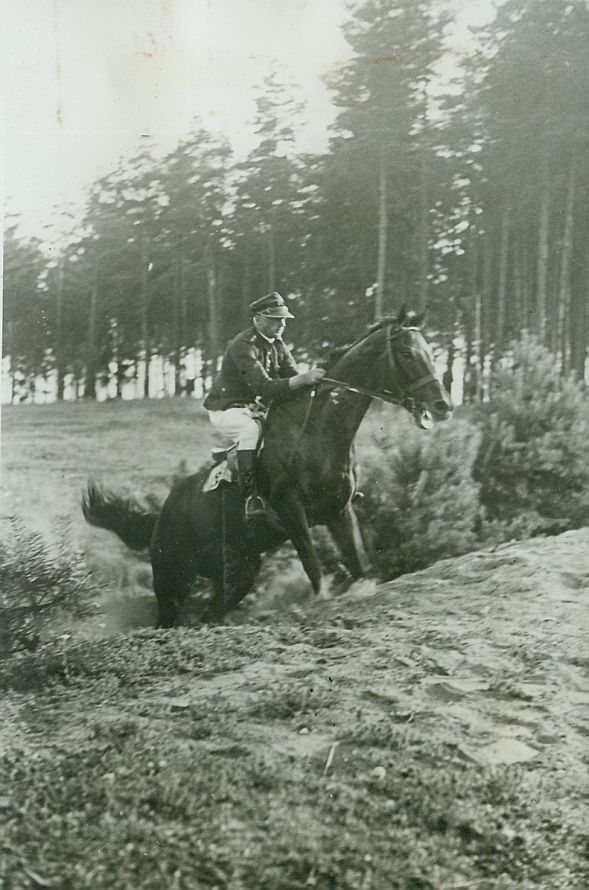 | Nr. inwentarzowy: MŁJ-XVI 1746 / 00 / 048 opis: Okolice toru wyścigów konnych. Bieg na przełaj - Jan Goszczyński (białe bryczesy, kurtka i czapka mundurowa) usiłuje wyjechać z piaszczystego rowu na koniu Amilkar. W tle zagajnik sosnowy.czas powstania - daty graniczne: 1936-07-05 - 1936-07-05miejsce: Wilno, Pośpieszka.osoby: Por. Jan Goszczyński (1896-?), 5 DAK, właściciel stajni wyścigowej.tworzywo: papier fotograficzny, błyszczącytechnika: odbitka żelatynowo-srebrowa DOP, czarno-białazespół: album rodziny Leskichwymiary (wys. x szer.): 128 x 87 [mm] Koń: 1. Amilcar - koń, na którym w biegach na przełaj startował por. J. Goszczyński.