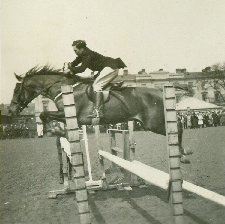 | Nr. inwentarzowy: MŁJ-XVI 1753 / 00 / 157 opis: Konkurs wewnętrzny Klubu Sportowego Rodziny Wojskowej na ujeżdżalni W.S.Woj. Laura Dobrutt skacze na koniu Centaur przez przeszkodę - triple-barre. Przy przeszkodzie stoi żołnierz (słabo widoczny), za szrankami widzowie, w tle zabudowania.data: w albumie: maj 1930 r., ale zawody odbyły się w połowie czerwcaczas powstania - daty graniczne: 1930-06-14 - 1930-06-15miejsce: Warszawa, ul. Koszykowa 79, Wyższa Szkoła Wojenna, ujeżdżalnia położona w kwartale: Koszykowa – Krzywickiego/Sucha – 6 Sierpnia/Nowowiejska – Topolowa/Al. Niepodległościosoby: Laura Dobruttowa 1896-1988 (z domu Weychert, jeździła na nartach i konno, w barwach Klubu Sportowego Rodziny Wojskowej wielokrotnie startowała w konkursach hipicznych, także w międzynarodowych w Warszawie).inne nazwy własne: W.S.W - WSW - W.S.Woj. - Wyższa Szkoła Wojennatworzywo: papier fotograficzny, błyszczącytechnika: odbitka żelatynowo-srebrowa DOP, czarno-białazespół: album rodziny Bohdanowiczówwymiary (wys. x szer.): 61 x 62 [mm] Koń: 1. Centaur, wałach, maść kasztanowata - po Mości Pan i Surja, hod. hr. Mycielska, wł. Laura Dobrutt - startowała na nim w konkursach, także w Warszawie, w Łazienkach
