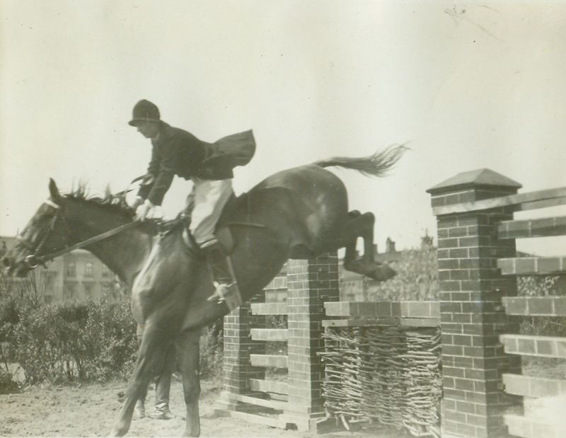 | Nr. inwentarzowy: MŁJ-XVI 1753 / 00 / 161 opis: Konkurs wewnętrzny Klubu Sportowego Rodziny Wojskowej na ujeżdżalni W.S.Woj. Laura Dobrutt na koniu Centaur podczas lądowania po skoku przez przeszkodę - wiklinową bramkę. Przy przeszkodzie stoi żołnierz (słabo widoczny).data: w albumie: maj 1930 r., ale zawody odbyły się w połowie czerwcaczas powstania - daty graniczne: 1930-06-14 - 1930-06-15miejsce: Warszawa, ul. Koszykowa 79, Wyższa Szkoła Wojenna, ujeżdżalnia położona w kwartale: Koszykowa – Krzywickiego/Sucha – 6 Sierpnia/Nowowiejska – Topolowa/Al. Niepodległościosoby: Laura Dobruttowa 1896-1988 (z domu Weychert, jeździła na nartach i konno, w barwach Klubu Sportowego Rodziny Wojskowej wielokrotnie startowała w konkursach hipicznych, także w międzynarodowych w Warszawie).inne nazwy własne: W.S.W - WSW - W.S.Woj. - Wyższa Szkoła Wojennatworzywo: papier fotograficzny, błyszczącytechnika: odbitka żelatynowo-srebrowa DOP, czarno-białazespół: album rodziny Bohdanowiczówwymiary (wys. x szer.): 86 x 109 [mm] Koń: 1. Centaur, wałach, maść kasztanowata - po Mości Pan i Surja, hod. hr. Mycielska, wł. Laura Dobrutt - startowała na nim w konkursach, także w Warszawie, w Łazienkach