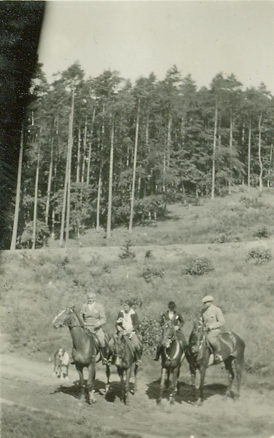 | Nr. inwentarzowy: MŁJ-XVI 1640 / 00 / 048 opis: Rajd Poznań-Gdynia, zorg. przez Śląski Klub Jazdy Konnej. Droga wzdłuż pokrytego szpilkowym lasem pagórka. Na stojących koniach: St. Grabianowski, K. Dobrogoyska (z pieskiem na siodle) - uczestnicy rajdu oraz kobieta w toczku i fraku i mężczyzna w marynarce i kaszkiecie. Wszyscy w bryczesach i długich butach. Obok duży pies.data: podano początkową i końcową datę rajduczas powstania - daty graniczne: 1933-08-03 - 1933-08-28miejsce: Gdynia, lasosoby: inż. Stanisław Grabianowski (1889-1957, szef wyprawy), Krystyna Dobrogoyska (1902-1975)tworzywo: papier fotograficzny, błyszczącytechnika: odbitka żelatynowo-srebrowa DOP, czarno-białazespół: album rodziny Brökerewymiary (wys. x szer.): 70 x 47 [mm]