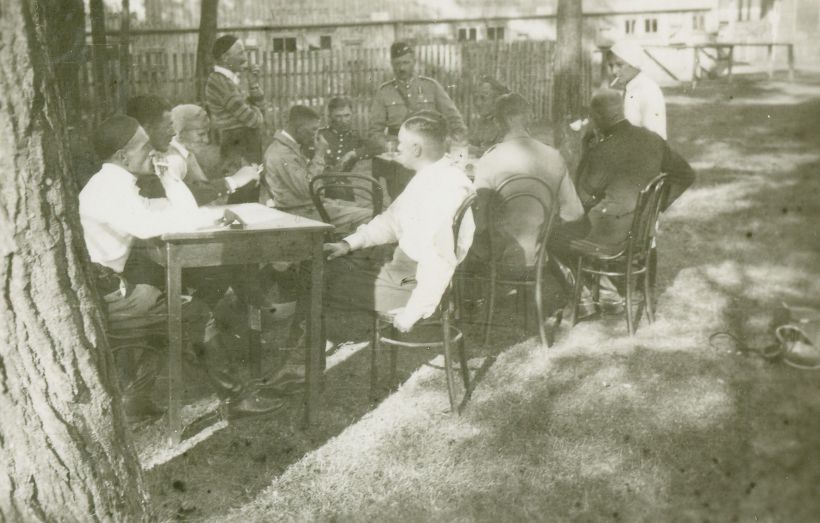| Nr. inwentarzowy: MŁJ-XVI 1757 / 00 / 024 opis: W cieniu, przy stołach siedzi kilkunastu mężczyzn, w większości w mundurach do jazdy konnej i cywilnych strojach jeździeckich. Z tyłu stoi jeden mężczyzna, z prawej stoi kobieta w jasnym stroju, z papierosem - Wanda Bohdanowicz. "Sportsmeni" jedzą śniadanie na torze wyścigowym, po porannej "robocie" (treningach).data: czerwiec-lipiec 1934 r.czas powstania - daty graniczne: 1934-06-01 - 1934-07-31miejsce: Wilno, Pośpieszkaosoby: Wanda Bohdanowicz zd. Leska (1908-1991), córka Juliusza Leskiego i Marii zd. Olszyńskiej, żona Michała Bohdanowicza.tworzywo: papier fotograficzny, błyszczącytechnika: odbitka żelatynowo-srebrowa DOP, czarno-białazespół: album rodziny Bohdanowiczówwymiary (wys. x szer.): 57 x 84 [mm]