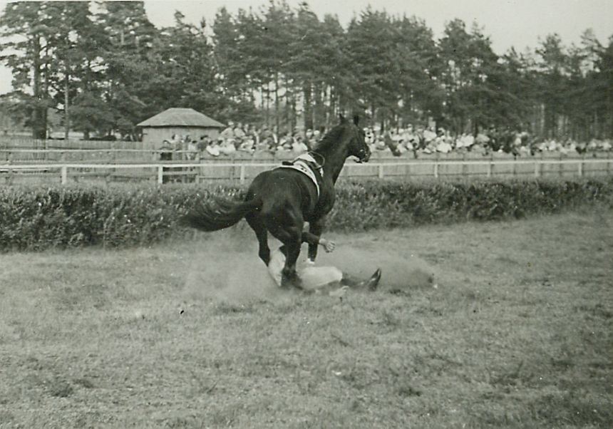 | Nr. inwentarzowy: MŁJ-XVI 1746 / 00 / 089 opis: Tor wyścigów konnych, Steeple-chase, upadek. Andrzej Szamota leży na bieżni, między nogami konia Herring, zasłania się ręką. Jeździec w stroju wyścigowym (białe bryczesy, jasna kurtka z ciemnymi rękawami). Koń hamuje. W tle żywopłot, zewnętrzna bariera, mały domek, ogrodzenie, publiczność, drzewa.czas powstania - daty graniczne: 1936-07-16 - 1936-07-16miejsce: Wilno, Pośpieszka.osoby: Ppor. Andrzej Szamota h. Prawdzic 13 p.u., 1939 awans na porucznika, poległ 24 września 1939 pod Suchowolą.tworzywo: papier fotograficzny, błyszczącytechnika: odbitka żelatynowo-srebrowa DOP, czarno-białazespół: album rodziny Leskichwymiary (wys. x szer.): 60 x 83 [mm] Koń: 1. Herring - koń, który startował pod rtm. Nestorowiczem w biegach na przełaj, a pod A. Szamotą w steeple-chase.
