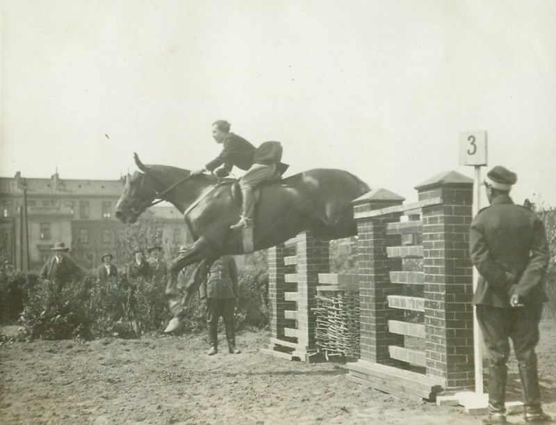 | Nr. inwentarzowy: MŁJ-XVI 1753 / 00 / 152 opis: Konkurs wewnętrzny Klubu Sportowego Rodziny Wojskowej na ujeżdżalni W.S.Woj. Maria Zwierzchowska skacze na koniu Hipcio przez przeszkodę nr 3 - wiklinową bramkę. Po bokach przeszkody stoją żołnierze, dalej kilka osób, w tle zabudowania.data: w albumie: maj 1930 r., ale zawody odbyły się w połowie czerwcaczas powstania - daty graniczne: 1930-06-14 - 1930-06-15miejsce: Warszawa, ul. Koszykowa 79, Wyższa Szkoła Wojenna, ujeżdżalnia położona w kwartale: Koszykowa – Krzywickiego/Sucha – 6 Sierpnia/Nowowiejska – Topolowa/Al. Niepodległościosoby: Maria Zwierzchowska 1901-1976 (od 1938 r. Karolowa Rómmlowa, już jako jego narzeczona poczyniła ogromne postępy w sztuce jeździeckiej i była jedną z najbardziej znanych amazonek - zawodniczek).inne nazwy własne: W.S.W - WSW - W.S.Woj. - Wyższa Szkoła Wojennatworzywo: papier fotograficzny, błyszczącytechnika: odbitka żelatynowo-srebrowa DOP, czarno-białazespół: album rodziny Bohdanowiczówwymiary (wys. x szer.): 84 x 114 [mm] Koń: 1. Hipcio, wałach - koń, na którym jeździła Maria Zwierzchowska