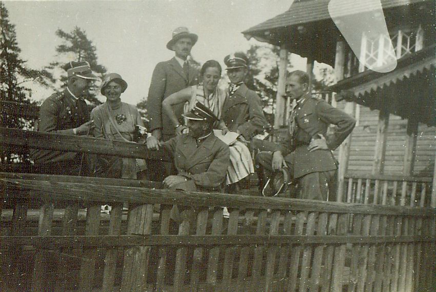| Nr. inwentarzowy: MŁJ-XVI 1756 / 02 / 018 opis: Tor wyścigów konnych podczas rozgrywania biegów na przełaj (cross'y). Na i przy drewnianej trybunie (od lewej): por. Michał Bohdanowicz (siedzi), Nina Michalewska (siedzi), cywil w garniturze i kapeluszu (stoi), Wanda Bohdanowicz (w letniej sukience), rtm. Bronisław Kulik (siedzi w cywilnym płaszczu na mundurze), rotmistrz (stoi w głębi, w mundurze), por. Jarosław Domański (stoi w mundurze z czapką w ręce).data: czerwiec 1933 r.czas powstania - daty graniczne: 1933-06-01 - 1933-06-30miejsce: Wilno, Pośpieszkaosoby: Por. Michał Bohdanowicz 1903-1948 (w l. 1932-36 w 4 p.u., "Miś"); Nina Michalewska; Wanda Bohdanowicz 1908-1991 (z domu Leska); rtm. Bronisław Kulik ur. 1897 r. (w l. 30. rotmistrz 4 p.u.); por. Jarosław Domański (ur. 1908, 4 p.u., "Sławek").tworzywo: papier fotograficzny, błyszczącytechnika: odbitka żelatynowo-srebrowa DOP, czarno-białazespół: album rodziny Bohdanowiczówwymiary (wys. x szer.): 57 x 82 [mm]