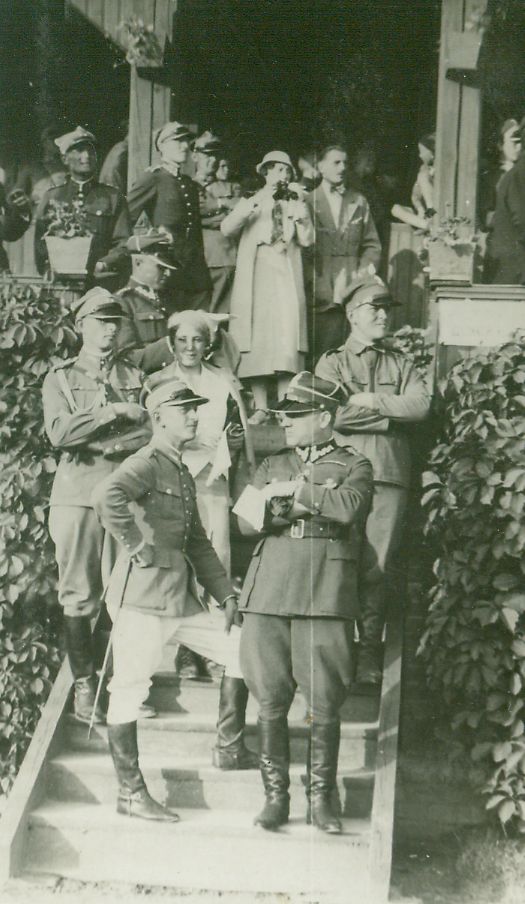 | Nr. inwentarzowy: MŁJ-XVI 1756 / 03 / 029 opis: Tor wyścigów konnych - fragment drewnianej trybuny z prowadzącymi do niej schodami. Na schodach i wewnątrz kilkanaście osób, w większości oficerów. Na schodach: od lewej, na 3. stopniu - por. Jarosław Domański, obok - Wanda Bohdanowicz, niżej, na pierwszym i drugim stopniu - por. Michał Bohdanowicz.data: miting wyścigowy w Baranowiczachczas powstania - daty graniczne: 1933-06-25 - 1933-07-06miejsce: Baranowiczeosoby: Por. Jarosław Domański (ur. 1908, 4 p.u., "Sławek"); Wanda Bohdanowicz 1908-1991 (z domu Leska); Por. Michał Bohdanowicz 1903-1948 (w l. 1932-1936 w 4 p.u., "Miś").tworzywo: papier fotograficzny, półbłyszczącytechnika: odbitka żelatynowo-srebrowa DOP, czarno-białazespół: album rodziny Bohdanowiczówwymiary (wys. x szer.): 109 x 66 [mm]