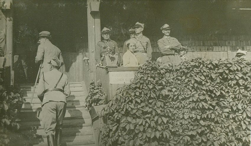 | Nr. inwentarzowy: MŁJ-XVI 1756 / 03 / 031 opis: Tor wyścigów konnych - fragment drewnianej trybuny z prowadzącymi do niej schodami i pnączami. Po schodach wchodzi cywil i wojskowy. Na trybunie, od lewej: rtm. Witold Uklański, rtm. Kazimierz Choroszewski (w głębi), por. Jarosław Domański, poniżej Wanda Bohdanowicz, płk Czesław Kozierowski.data: miting wyścigowy w Baranowiczachczas powstania - daty graniczne: 1933-06-25 - 1933-07-06miejsce: Baranowiczeosoby: Rtm. Witold Uklański 1893-1954 (4 p.u., później cichociemny, zamordowany we Wronkach); por. Jarosław Domański (ur. 1908, 4 p.u., "Sławek"); Wanda Bohdanowicz 1908-1991 (z domu Leska); rtm. Kazimierz Choroszewski ur. 1898 (rtm. 4 p.u. uczestnik zawodów wojskowych wyścigów, później PSZ), płk.Czesław Kozierowski (1890-1940 Charków), do 1932 dow. 4 p.u., potem O.T.O., lubiany, popierał sport i wyścigi).inne nazwy własne: O.T.O. - Oficerski Trybunał Orzekającytworzywo: papier fotograficzny, półbłyszczącytechnika: odbitka żelatynowo-srebrowa DOP, czarno-białazespół: album rodziny Bohdanowiczówwymiary (wys. x szer.): 64 x 106 [mm]