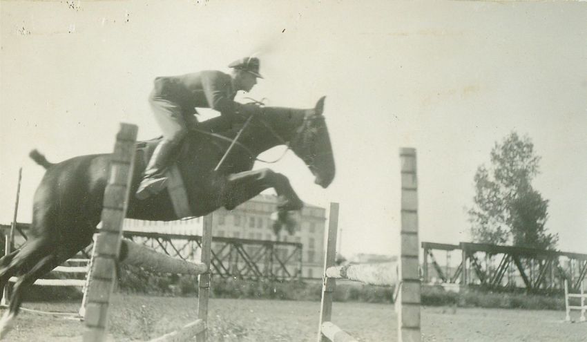 | Nr. inwentarzowy: MŁJ-XVI 1753 / 00 / 070 opis: Rtm. Wilhelm Lewicki na koniu Karny w treningowym skoku przez okser. W tle okazały gmach i stalowe konstrukcje przęseł.data: wrzesień 1929 r.czas powstania - daty graniczne: 1929-09-01 - 1929-09-30miejsce: Warszawa, ul. Koszykowa 79, Wyższa Szkoła Wojenna, ujeżdżalniaosoby: Rtm. Wilhelm Rogala-Lewicki 1898-1992 Londyn ("Wil", jeździec klasy międzynarodowej, w 1929 r. reprezentował w konkursach W.S.W. - był w niej głównym instruktorem jazdy konnej)inne nazwy własne: W.S.W - WSW - W.S.Woj. - Wyższa Szkoła Wojennatworzywo: papier fotograficzny, błyszczącytechnika: odbitka żelatynowo-srebrowa DOP, czarno-białazespół: album rodziny Bohdanowiczówwymiary (wys. x szer.): 70 x 113 [mm] Koń: 1. Karny - koń, na którym na przełomie l. 20. i 30. startował w skokach przez przeszkody rtm. Wilhelm Lewicki, m.in. w Warszawie i Gdyni. Później dosiadała go H. Orthweinówna. Karny miał kurtyzowany ogon.