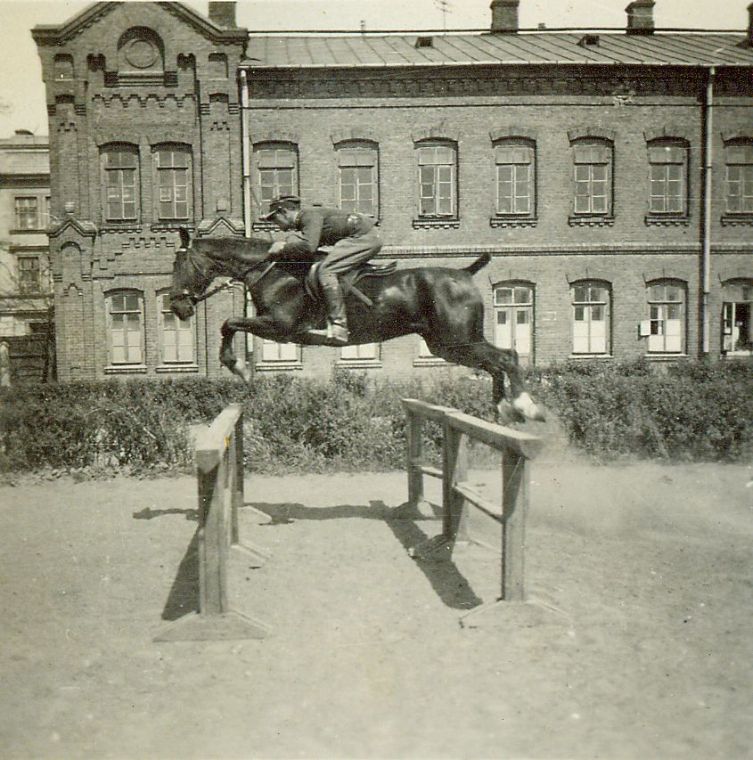 | Nr. inwentarzowy: MŁJ-XVI 1753 / 00 / 143 opis: Rtm. Wilhelm Lewicki w treningowym skoku przez przeszkodę - okser na koniu Karny. W tle budynki.data: maj 1930 r.czas powstania - daty graniczne: 1930-05-01 - 1930-05-31miejsce: Warszawa, ul. Koszykowa 79, Wyższa Szkoła Wojenna, ujeżdżalnia położona w kwartale: Koszykowa – Krzywickiego/Sucha – 6 Sierpnia/Nowowiejska – Topolowa/Al. Niepodległościosoby: Rtm. Wilhelm Rogala-Lewicki 1898-1992 Londyn ("Wil", jeździec klasy międzynarodowej, w 1929 r. reprezentował w konkursach W.S.W. - był w niej głównym instruktorem jazdy konnej).tworzywo: papier fotograficzny, błyszczącytechnika: odbitka żelatynowo-srebrowa DOP, czarno-białazespół: album rodziny Bohdanowiczówwymiary (wys. x szer.): 61 x 61 [mm] Koń: 1. Karny - koń, na którym na przełomie l. 20. i 30. startował w skokach przez przeszkody rtm. Wilhelm Lewicki, m.in. w Warszawie i Gdyni. Później dosiadała go H. Orthweinówna. Karny miał kurtyzowany ogon.
