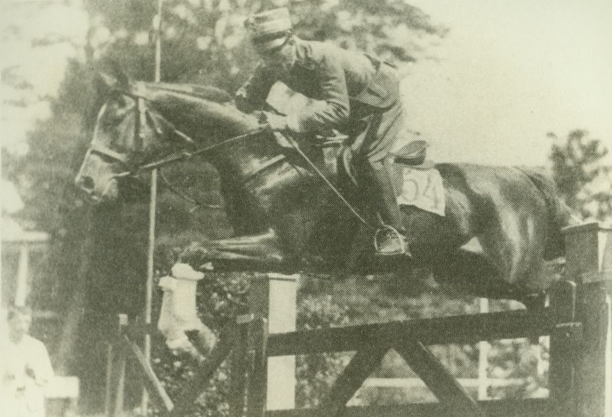 | Nr. inwentarzowy: MŁJ-XVI 1639 / 00 / 027 opis: Włoch mjr Tommaso Lequio skacze na kasztanowatym koniu Ali przez płotek - stacjonatę z desek. W ręku jeźdźca palcat. Koń w sportowym rzędzie, potnik z nr. 64, ogłowie wędzidłowe z wytokiem, na przednich nadpęciach grube bandaże. Z tyłu mężczyzna w jasnym ubraniu, zieleń.czas powstania - daty graniczne: 1929-01-01 - 1939-08-31osoby: Włoch mjr Tommaso Lequio di Assaba - w l. 1929-39 23 CSIO, 8 PN, instruktor w Pinerolo i Tor di Quinto, prezes FISE (Federazione Italiana Sport Equestritworzywo: papier fotograficzny, matowytechnika: odbitka żelatynowo-srebrowa z wydrukuzespół: album Clemensa Nagla Międzynarodowi artyści w jeździe przez przeszkodywymiary (wys. x szer.): 122 x 173 [mm]