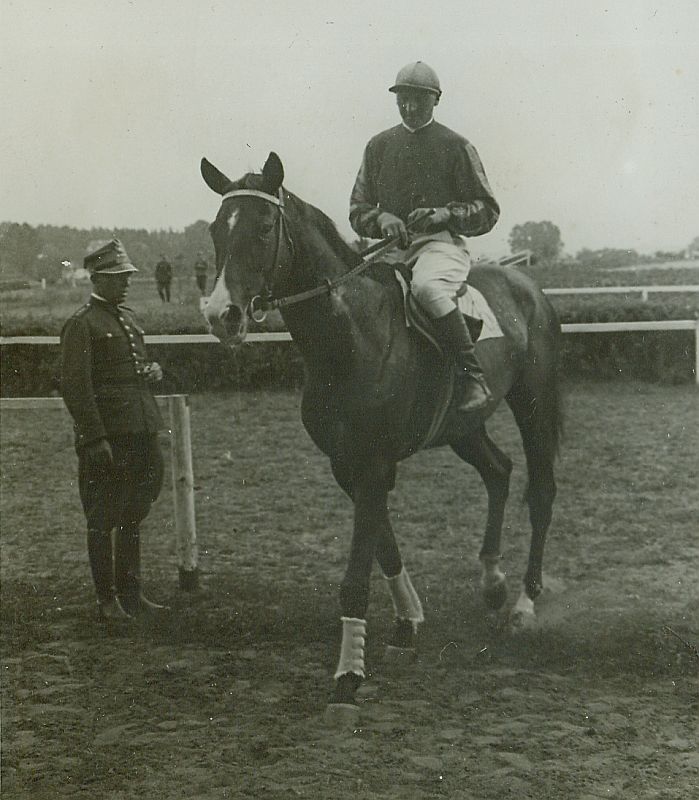 | Nr. inwentarzowy: MŁJ-XVI 1746 / 00 / 087 opis: Tor wyścigów konnych, Steeple-chase. Michał Bohdanowicz na koniu Nic ci do tego wraca do wagi po wygraniu. Jeździec w stroju wyścigowym (ciemna kurtka z jaśniejszymi pasami na rękawach, białe bryczesy, czapka w tonacji pasów). Koń z zabandażowanymi przednimi nogami, przechodzi stępem przez przejście z bieżni. W tle bieżnia, bariera, przy przejściu stoi oficer w mundurze.czas powstania - daty graniczne: 1936-07-16 - 1936-07-16miejsce: Wilno, Pośpieszka.osoby: Rtm. Michał Bohdanowicz "Miś" (1903-1948), 13 p.u., dowódca 1 szwadronu "Tatarskiego". tworzywo: papier fotograficzny, błyszczącytechnika: odbitka żelatynowo-srebrowa DOP, czarno-białazespół: album rodziny Leskichwymiary (wys. x szer.): 96 x 84 [mm] Koń: 1. Nic ci do tego - koń, na którym M. Bohdanowicz startował w steeple-chase.