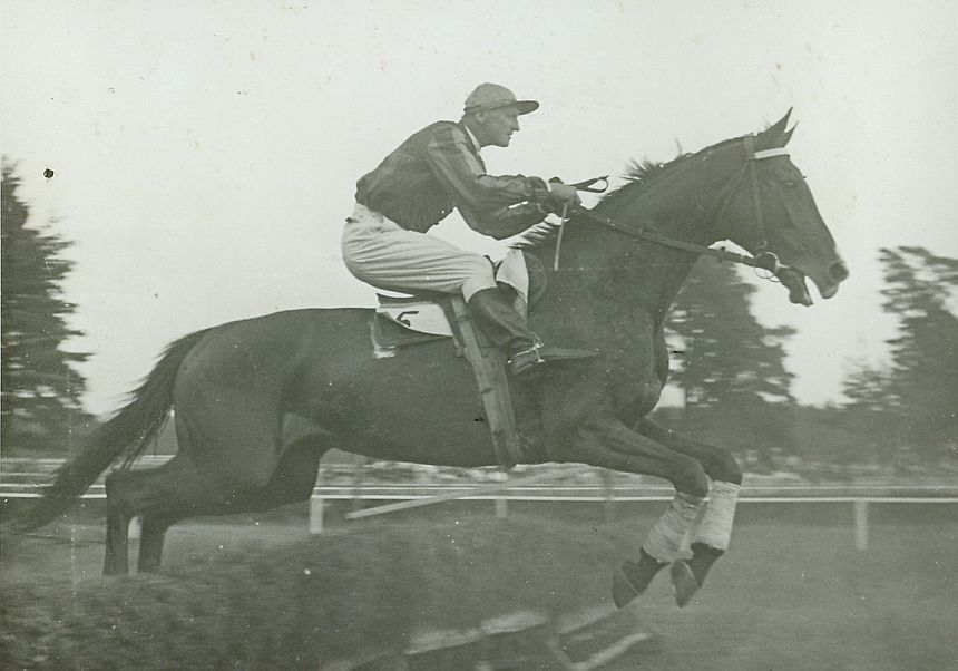 | Nr. inwentarzowy: MŁJ-XVI 1746 / 00 / 079 opis: Tor wyścigów konnych. Steeple-chase – Nic ci do tego pod Michałem Bohdanowiczem w skoku przez hyrdę. Jeździec w stroju wyścigowym - białe bryczesy, ciemna kurtka z jaśniejszymi podłużnymi pasami na rękawach, czapka, w ręku bacik. W tle bariera, drzewa.czas powstania - daty graniczne: 1936-07-16 - 1936-07-16miejsce: Wilno, Pośpieszka.osoby: Rtm. Michał Bohdanowicz "Miś" (1903-1948), 13 p.u., dowódca 1 szwadronu "Tatarskiego".tworzywo: papier fotograficzny, błyszczącytechnika: odbitka żelatynowo-srebrowa DOP, czarno-białazespół: album rodziny Leskichwymiary (wys. x szer.): 84 x 117 [mm] Koń: 1. Nic ci do tego - koń, na którym M. Bohdanowicz startował w steeple-chase.