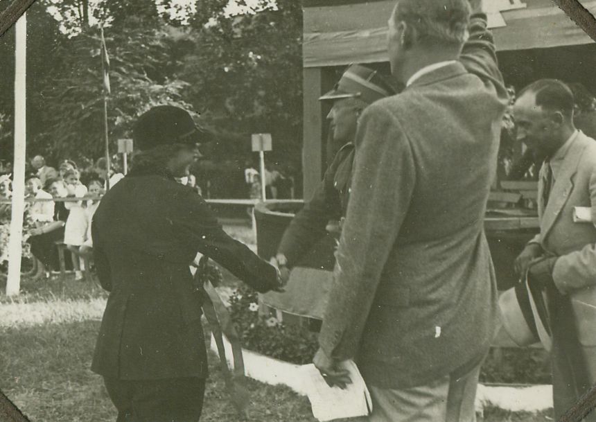 | Nr. inwentarzowy: MŁJ-XVI 1629 / 00 / 026 opis: Na trawiastym, ogrodzonym placu Jadwiga Grotthus odbiera 2. nagrodę ( 50,00 zł) i gratulacje (uścisk ręki) od płk. Romualda Niementowskiego. Obok stoi 2 cywili. Z tyłu wiata - trybuna(?), dalej publiczność, drzewa.data: ciepła pora rokuczas powstania - daty graniczne: 1938-03-01 - 1939-08-31miejsce: Hrubieszówosoby: płk Romuald Niementowski (wiceprezes zarządu HKJ, dowódca 2 p.s.k. w Hrubieszowie), Jadwiga Grotthus (1920-2011), córka Gustawa i Anny zd. Chłapowskiejinne nazwy własne: Hrubieszowski Klub Jeździecki, 2 Pułk Strzelców Konnychtworzywo: papier fotograficzny, błyszczącytechnika: odbitka żelatynowo-srebrowa DOP, czarno-białazespół: album rodziny Grotthuswymiary (wys. x szer.): 61 x 84 [mm]