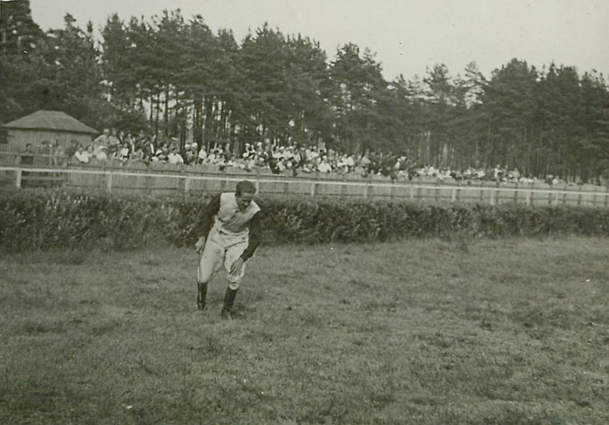 | Nr. inwentarzowy: MŁJ-XVI 1746 / 00 / 091 opis: Tor wyścigów konnych, Steeple-chase, upadek. Andrzej Szamota podniósł się z bieżni, trzyma się za kolano. Jeździec w stroju wyścigowym (białe bryczesy, jasna kurtka z ciemnymi rękawami, brak czapki, w ręku bacik). W tle żywopłot, zewnętrzna bariera, mały domek, ogrodzenie, publiczność, drzewa.czas powstania - daty graniczne: 1936-07-16 - 1936-07-16miejsce: Wilno, Pośpieszka.osoby: Ppor. Andrzej Szamota h. Prawdzic 13 p.u., 1939 awans na porucznika, poległ 24 września 1939 pod Suchowolą.tworzywo: papier fotograficzny, błyszczącytechnika: odbitka żelatynowo-srebrowa DOP, czarno-białazespół: album rodziny Leskichwymiary (wys. x szer.): 60 x 84 [mm]