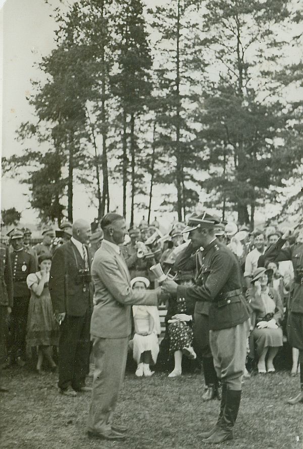 | Nr. inwentarzowy: MŁJ-XVI 1746 / 00 / 056 opis: Tor wyścigów konnych. Na trawiastym placu Antoni Żelewski (w mundurze) wręcza Michałowi Bohdanowiczowi (w garniturze) pucharek - nagrodę 8 Pułku Ułanów Ks. Józefa Poniatowskiego. Za nimi licznie zgromadzona publiczność. W pierwszym rzędzie siedzą kobiety, pozostali stoją, jeden z oficerów salutuje. Za siedzącymi paniami widać kilku grających trębaczy.czas powstania - daty graniczne: 1936-06-28 - 1936-07-09miejsce: Wilno, Pośpieszka.osoby: Rtm. Michał Bohdanowicz "Miś" (1903-1948), 13 p.u., dowódca 1 szwadronu "Tatarskiego". Por. Antoni Żelewski (1905-1994), 8 p.u., jeździec klasy międzynarodowej, instruktor.tworzywo: papier fotograficzny, błyszczącytechnika: odbitka żelatynowo-srebrowa DOP, czarno-białazespół: album rodziny Leskichwymiary (wys. x szer.): 130 x 87 [mm]