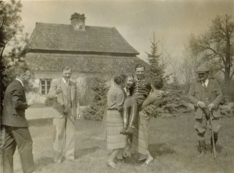 | Nr. inwentarzowy: MŁJ-XVI 1753 / 00 / 138 opis: Grupa rozbawionych osób przed budynkiem gospodarczym z charakterystycznym dachem. Od lewej: młody mężczyzna w ciemnym garniturze, Jerzy Pietraszewski, rtm. Wilhelm Lewicki (w mundurze) trzymany na rękach przez trzy panie - Wandę Leską, Zofię Pietraszewską i Annę Leską, starszy od pozostałych mężczyzna z laską (w kaszkiecie, marynarce z kamizelką, bryczesach i wysokich butach).data: kwiecień 1930 r.czas powstania - daty graniczne: 1930-04-01 - 1930-04-30miejsce: Parzniewice (łódzkie, majątek Kotlińskich, od 1931 r. Wereszczyńskich)osoby: Jerzy Pietraszewski 1903-1974 lub 1982 („Jurek”, syn Zygmunta wł. maj. w Drzazgowej Woli i Janiny zd. Wróblewskiej, brat Zofii); Rtm. Wilhelm Rogala-Lewicki 1898-1992 ("Wil"); Wanda Leska 1908-1991 (później Bohdanowicz); Zofia Pietraszewska 1910-1983 („Zosia”, córka Zygmunta wł. maj. w Drzazgowej Woli i Janiny zd. Wróblewskiej, siostra Jerzego); Anna Leska 1910-1998 ("Anka", później Leska-Daab).tworzywo: papier fotograficzny, błyszczącytechnika: odbitka żelatynowo-srebrowa DOP, czarno-białazespół: album rodziny Bohdanowiczówwymiary (wys. x szer.): 85 x 111 [mm]