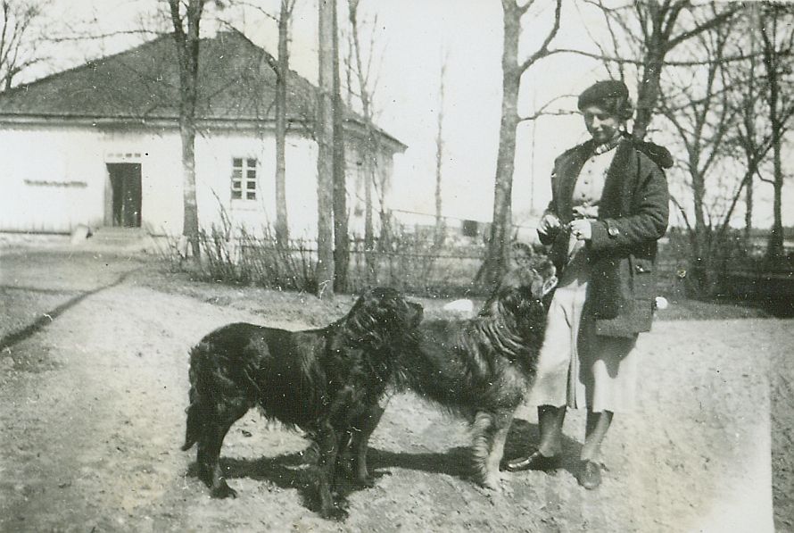| Nr. inwentarzowy: MŁJ-XVI 1747 / 00 / 033 opis: Wielkanoc. Na spacerze w parku Krystyna Bohdanowicz z dużymi, długowłosymi psami Lump i Lord. W tle pawilon lub skrzydło dworu.czas powstania - daty graniczne: 1938-04-17 - 1938-04-17miejsce: Stajki - majątek Bohdanowiczów, obecnie wieś na Białorusi w rejonie wilejskim, obwodu mińskiegoosoby: Krystyna Bohdanowicz - siostra Michała Bohdanowicza, współwłaścicielka Stajek..tworzywo: papier fotograficzny, błyszczącytechnika: odbitka żelatynowo-srebrowa DOP, czarno-białazespół: album rodziny Leskichwymiary (wys. x szer.): 56 x 83 [mm]