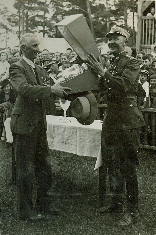 | Nr. inwentarzowy: MŁJ-XVI 1758 / 00 / 046 opis: Tor wyścigów konnych, por. Jan Goszczyński (w garniturze) odbiera nagrodę - efektowny puchar w stosownym pudle z rąk płk. Czesława Kozierowskiego (w mundurze). Nagroda za zwycięstwo w jednym z dwóch wyścigów przeszkodowych: Steeple-chase im. Hetmana Stanisława Żółkiewskiego (og. Grzela) lub Steeple-chase im. Wojewody Wileńskiego (og. Poznaniak). W tle stół, publiczność, fragment trybuny, drzewa.czas powstania - daty graniczne: 1935-06-30 - 1935-06-30miejsce: Wilno, Pośpieszkaosoby: Por. Jan Goszczyński ur. 1896 (5 DAK, właściciel stajni wyścigowej, trener i jeździec wyścigowy); płk.Czesław Kozierowski 1890-1940 Charków (do 1932 dow. 4 p.u., potem O.T.O., lubiany, popierał sport i wyścigi, bardzo aktywny jako wiceprezes Wileńskiego Towarzystwa Hodowli Koni i Popierania Sportu Konnnego).inne nazwy własne: O.T.O. - Oficerski Trybunał Orzekającytworzywo: papier fotograficzny, błyszczącytechnika: odbitka żelatynowo-srebrowa DOP, czarno-białazespół: album rodziny Bohdanowiczówwymiary (wys. x szer.): 123 x 87 [mm]