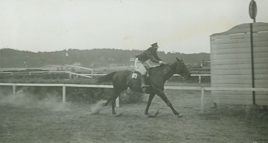 | Nr. inwentarzowy: MŁJ-XVI 1746 / 00 / 038 opis: Tor wyścigów konnych, bieg na przełaj Wiazynia (wieś w powiecie wilejskim, obecnie na Białorusi). Tuż przed celownikiem galopuje Michał Bohdanowicz na koniu Równy - zwyciężają Nagrodę Wiazynia (pow. wilejski, woj. wileńskie). Jeździec w jasnych bryczesach, kurtce i czapce mundurowej. Na jasnym potniku numer 3.data: W albumie między wydarzeniami z 2 a 5 lipca 1936 r.czas powstania - daty graniczne: 1936-07-02 - 1936-07-05miejsce: Wilno, Pośpieszka.osoby: Rtm. Michał Bohdanowicz "Miś" (1903-1948), 13 p.u., dowódca 1 szwadronu "Tatarskiego". tworzywo: papier fotograficzny, błyszczącytechnika: odbitka żelatynowo-srebrowa DOP, czarno-białazespół: album rodziny Leskichwymiary (wys. x szer.): 70 x 127 [mm] Koń: 1. Równy, wałach, rasa: półkrwi, maść skarogniada - po Konwent i Powaga, hod. St. Ciemniewski, wł. rtm. K. Choroszewski. Startowali na nim w biegach na przełaj i steeple-chase M. Bohdanowicz i wł. Żelewski