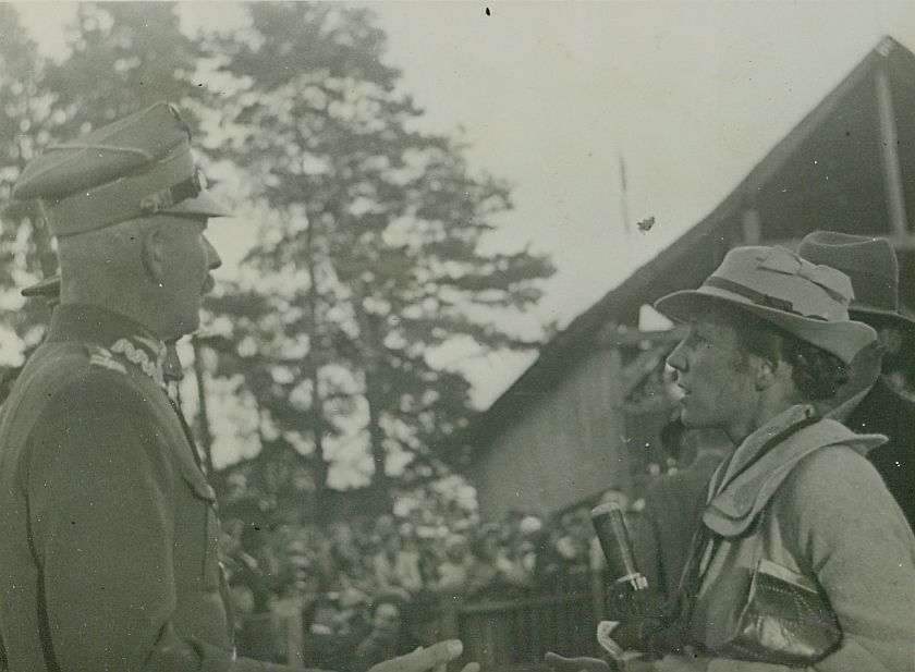 | Nr. inwentarzowy: MŁJ-XVI 1746 / 00 / 075 opis: Tor wyścigów konnych. Wanda Bohdanowicz w rozmowie z Czesławem Kozierowskim. Kobieta w jasnym kapeluszu i płaszczu, pułkownik w mundurze. Według opisu wymieniają pochlebne uwagi o koniu Równy. W tle ogrodzenie, publiczność, drewniany budynek, drzewa.czas powstania - daty graniczne: 1936-07-05 - 1936-07-12miejsce: Wilno, Pośpieszka.osoby: Płk Czesław Kozierowski (1890-1940 Charków), do 1932 dow. 4 p.u., potem O.T.O. (Oficerski Trybunał Orzekający), lubiany, popierał sport i wyścigi. Wanda Bohdanowicz zd. Leska (1908-1991), córka Juliusza Leskiego i Marii zd. Olszyńskiej, żona Michała Bohdanowicza.tworzywo: papier fotograficzny, błyszczącytechnika: odbitka żelatynowo-srebrowa DOP, czarno-białazespół: album rodziny Leskichwymiary (wys. x szer.): 83 x 113 [mm] Koń: 1. Równy, wałach, rasa: półkrwi, maść skarogniada - po Konwent i Powaga, hod. St. Ciemniewski, wł. rtm. K. Choroszewski. Startowali na nim w biegach na przełaj i steeple-chase M. Bohdanowicz i wł. Żelewski, na zdjęciu: niewidoczny na zdjęciu