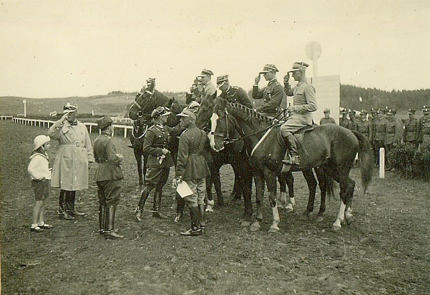 | Nr. inwentarzowy: MŁJ-XVI 1756 / 02 / 021 opis: Tor wyścigów konnych podczas rozgrywania konkursów (championat’u). Wręczanie nagród za ciężki konkurs oficerski. W nierównym szeregu na bieżni toru stoi sześć koni z oficerami na grzbietach. Najbliżej widza na koniu Talar por. Michał Bohdanowicz - VI nagroda. Z przodu kilku oficerów i chłopczyk w marynarskim ubranku, z tyłu, koło celownika ok. 10 żołnierzy.data: czerwiec 1933 r.czas powstania - daty graniczne: 1933-06-01 - 1933-06-30miejsce: Wilno, Pośpieszkaosoby: Por. Michał Bohdanowicz 1903-1948 (syn Jana Bohdanowicza i Marii z Cywińskich. W latach 1932-1936 i przed II wojną w 4 Pułku Ułanów Zaniemeńskich, od 1936 w 13 Pułku Ułanów Wileńskich; nazywany "Misiem").tworzywo: papier fotograficzny, błyszczącytechnika: odbitka żelatynowo-srebrowa DOP, czarno-białazespół: album rodziny Bohdanowiczówwymiary (wys. x szer.): 42 x 58 [mm] Koń: 1. Talar III, wałach, maść kasztanowata - hod. Bogumiła Hebanowskiego; ur. przed 1928, prywatny koń Michała Bohdanowicza, który startował na nim w konkursach ujeżdżenia, skoków (np. Mitingi Popularne PZJ 1938-39 i WKKW ("Militari"), biegach myśliwskich, skiringu, uczestniczył w ćwiczeniach wojskowych. Dosiadała go też żona Michała - Wanda (m.in. w 1937 r. w Grudziądzu)..