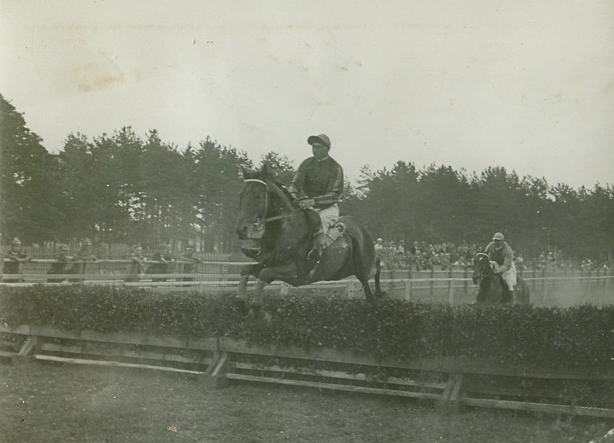 | Nr. inwentarzowy: MŁJ-XVI 1746 / 00 / 061 opis: Tor wyścigów konnych, gonitwa płotowa. Michał Bohdanowicz (białe bryczesy, ciemna kurtka z podłużnymi pasami na rękawach, jasna czapka) na koniu Trabuco w skoku przez hyrdę (płot). Do przeszkody zbliża się inny jeździec. W tle bariera, ogrodzenie, publiczność,drzewa.czas powstania - daty graniczne: 1936-07-12 - 1936-07-12miejsce: Wilno, Pośpieszka.osoby: Rtm. Michał Bohdanowicz "Miś" (1903-1948), 13 p.u., dowódca 1 szwadronu "Tatarskiego".tworzywo: papier fotograficzny, błyszczącytechnika: odbitka żelatynowo-srebrowa DOP, czarno-białazespół: album rodziny Leskichwymiary (wys. x szer.): 83 x 112 [mm] Koń: 1. Trabuco - Palü – Traumliese, koń Michała Bohdanowicza, na którym startował w wyścigach płotowych.