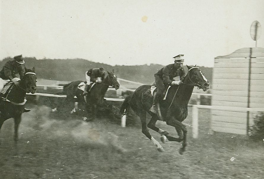 opis: Tor wyścigów konnych - Steeple-chase Horoźca [jeden z większych majątków na Wołyniu, należał do rodziny rodziny de Pourbaix]. Na celowniku, od prawej: Fama II (Wizja) - I miejsce pod por. Tadeuszem Gieryczem, Discretion - III miejsce pod rtm. Michałem Bohdanowiczem, Zazula - II miejsce pod por. Wołkowiczem.