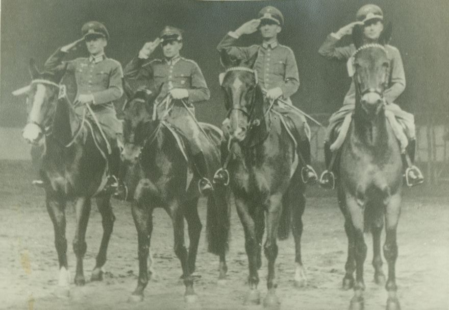 | Nr. inwentarzowy: MŁJ-XVI 1639 / 00 / 019 opis: Triumfatorzy Grossen Preis der Nationalsozialistischen Erhebung: 1. miejsce H.H. Brinckmann (Baron), 2/3. J. Komorowski (Zbieg II), 2/3. K. Hasse (Tora), 4. H. Momm (Alchimist). Siedzą na koniach i salutują niewidocznym: ministrowi propagandy III Rzeszy dr. Josephowi Goebbelsowi i naczelnemu dowódcy wojsk lądowych gen. Waltherowi von Brauchitschowi.czas powstania - daty graniczne: 1939-04-15 - 1939-04-24miejsce: Berlinosoby: J. Komorowski i Niemcy: rtm. Hans Heinrich Brinckmann "Micky", rtm. Janusz Komorowski, rtm. Kurt Hasse, Harald Momm; niewidoczni: ministrowi propagandy III Rzeszy dr Joseph Goebbels i naczelny dowódca wojsk lądowych gen. Walther von Brauchitsch.tworzywo: papier fotograficzny, matowytechnika: odbitka żelatynowo-srebrowa z innej odbitkizespół: album Clemensa Nagla Międzynarodowi artyści w jeździe przez przeszkodywymiary (wys. x szer.): 124 x 174 [mm] Konie: 1. Zbieg II, wałach, rasa: 1/2 krwi deresz i am. kłusaczka, maść gniado-dereszowata, ur. 1927 - Derwisz-Brunetka, hod. Stępczyński, wł. CWK. Mocny, szybki, ogromna potęga. W 1936 wygrał PN w Rydze. Startował pod Sokołowskim na IO w Berlinie w skokach. Do wojny startował pod J. Komorowskim, m.in. 1. m. w PN na CHIO w Warszawie 1938 r., na zdjęciu: 12 lat 2. Alchimist, rasa: hanowerska 3. Baron 4. Tora, klacz - mistrzostwo olimpijskie w 1936 r.