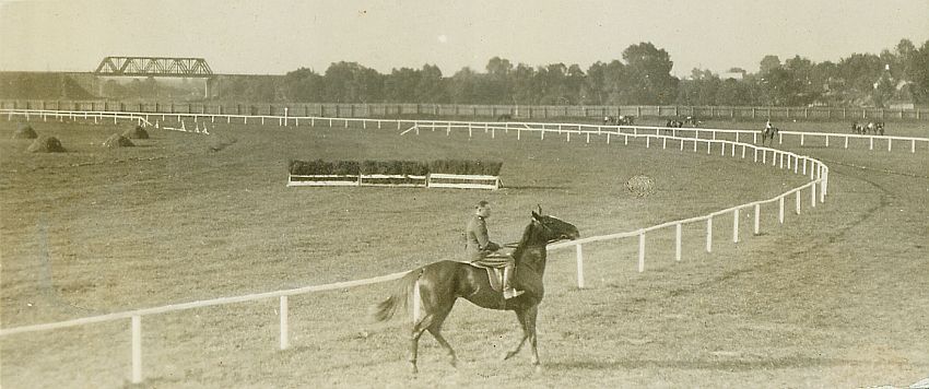 | Nr. inwentarzowy: MŁJ-XVI 1751 / 00 / 022 opis: Tor wyścigów konnych. Na bieżni toru stępuje zdenerwowanego, kasztanowatego konia por. Jerzy Strużyński. Jeździec w mundurze. Widać przeszkodę - płot, inne konie i jeźdźców, most kolejowy.data: ciepła pora roku, po pierwszym pokosieczas powstania - daty graniczne: 1927-05-20 - 1927-10-30miejsce: Lublin, Ruryosoby: Por. Jerzy Strużyński ur. 1897; 14 p.u., jeździec, trener i właściciel stajni wyścigowej.tworzywo: papier fotograficzny, półbłyszczącytechnika: odbitka żelatynowo-srebrowa DOP, czarno-białazespół: album rodziny Bohdanowiczówwymiary (wys. x szer.): 40 x 92 [mm]