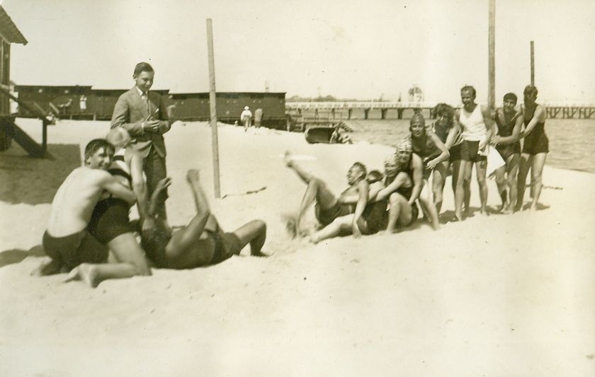 | Nr. inwentarzowy: MŁJ-XVI 1753 / 00 / 016 opis: Kilkanaście osób bawi się na plaży w "przeciąganie liny". Jeden młody mężczyzna w marynarce i pumpach, pozostali w strojach plażowych. W ciemnych kostiumach i kolorowych czepkach (obok siebie) siostry Anna i Wanda Leskie. Za nimi Ada Wiszniewska(?). Dalej, w jasnej koszulce Jerzy Mokrzycki(?). W tle szatnie, molo.data: lipiec - sierpień 1929 r.czas powstania - daty graniczne: 1929-07-01 - 1929-08-31miejsce: Gdyniaosoby: Wanda Leska 1908-1991 (później Bohdanowicz); Anna Leska 1910-1998 (Anka, później Leska-Daab); Ada (Adela?) Wiszniewska (nazwisko może być inne, podobne); Jerzy Mokrzycki (Jurek, nazwisko może być inne, podobne)tworzywo: papier fotograficzny, półmatowytechnika: odbitka żelatynowo-srebrowa DOP, tonowana?zespół: album rodziny Bohdanowiczówwymiary (wys. x szer.): 89 x 138 [mm]