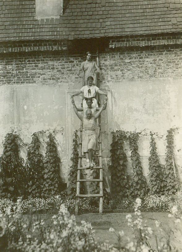 | Nr. inwentarzowy: MŁJ-XVI 1753 / 00 / 053 opis: Na opartej o ścianę, wysokiej drabinie (od góry): Barbara M., Janina Kotlińska, Wanda Leska i Anna Leska. Kobiety w letnich sukienkach.data: sierpień 1929 r.czas powstania - daty graniczne: 1929-08-01 - 1929-08-31miejsce: Parzniewice (łódzkie, majątek Kotlińskich, od 1931 r. Wereszczyńskich)osoby: Barbara M. ("Basia" [Madalińska?, Makólska?]); Janina Kotlińska 1907-1989 („Nina”, "Ninon", córka Kazimierza i Eugenii zd. Grudzińskiej, siostra Edmunda);