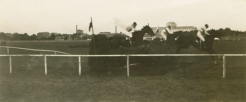 | Nr. inwentarzowy: MŁJ-XVI 1751 / 00 / 032 opis: Tor wyścigów konnych, gonitwa przeszkodowa. Trzy konie na przeszkodzie - żywopłocie z rowem. Na pierwszej i drugiej pozycji jeźdźcy w jasnych kurtkach z poprzecznym pasem. Na trzeciej pozycji (w skoku) Jerzy Strużyński (barwy stajni J. Strużyńskiego: k. żółta z poprzecznym białym pasem, cz. czarna) na koniu Danina. 28 czerwca Danina była druga, gonitwy 14 i 19 lipca wygrała.data: jeden z dni: 28 czerwca, 14 lipca, 19 lipca 1931czas powstania - daty graniczne: 1931-06-28 - 1931-07-19miejsce: Lublin, Ruryosoby: Por. Jerzy Strużyński ur. 1897; 14 p.u., jeździec, trener i właściciel stajni wyścigowej.tworzywo: papier fotograficzny, błyszczący, Azuratechnika: odbitka żelatynowo-srebrowa DOP, czarno-białazespół: album rodziny Bohdanowiczówwymiary (wys. x szer.): 40 x 96 [mm] Koń: 1. Danina, klacz, rasa: xx, maść gniada, ur. 1924 - Hugon — Delightful Morning, hod. Henryka Woźniakowskiego, wł. Z. Rogowski, od 1930 Jerzy Strużyński; brała udział w gonitwach przeszkodowych na przełomie l. 20-30. XX w. na torach w Warszawie, Lwowie, Lublinie, Piotrkowie, Tarnowskich Górach, Przemyślu, Łodzi, najczęściej pod trenerem i właścicielem J. Strużyńskim, wielokrotnie wygrywając.