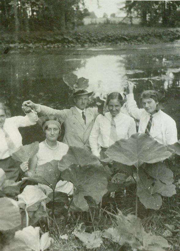 | Nr. inwentarzowy: MŁJ-XVI 1753 / 00 / 054 opis: Nad wodą, wśród liści łopianu (od lewej): Anna Leska (widać część sylwetki), Barbara M., Stanisław Madaliński (w garniturze i kapeluszu), Wanda Leska, Janina Kotlińska. Siostry Leskie i Janina w jasnych bluzkach z długimi rękawami i krawatach.data: sierpień 1929 r.czas powstania - daty graniczne: 1929-08-01 - 1929-08-31miejsce: Sobaków (łódzkie, majątek Stanisława Madalińskiego)osoby: Anna Leska 1910-1998 ("Anka", później Leska-Daab, podczas II wojny światowej pilot w Wielkiej Brytanii); Barbara M. ("Basia" [Madalińska?, Makólska?]); Stanisław Madaliński ("Dziedzic", właściciel Sobakowa); Wanda Leska 1908-1991 (od 1932 r. Bohdanowicz); Janina Kotlińska 1907-1989 („Nina”, "Ninon", córka Kazimierza i Eugenii zd. Grudzińskiej, siostra Edmunda)tworzywo: papier fotograficzny, błyszczącytechnika: odbitka żelatynowo-srebrowa DOP, czarno-białazespół: album rodziny Bohdanowiczówwymiary (wys. x szer.): 84 x 61 [mm]