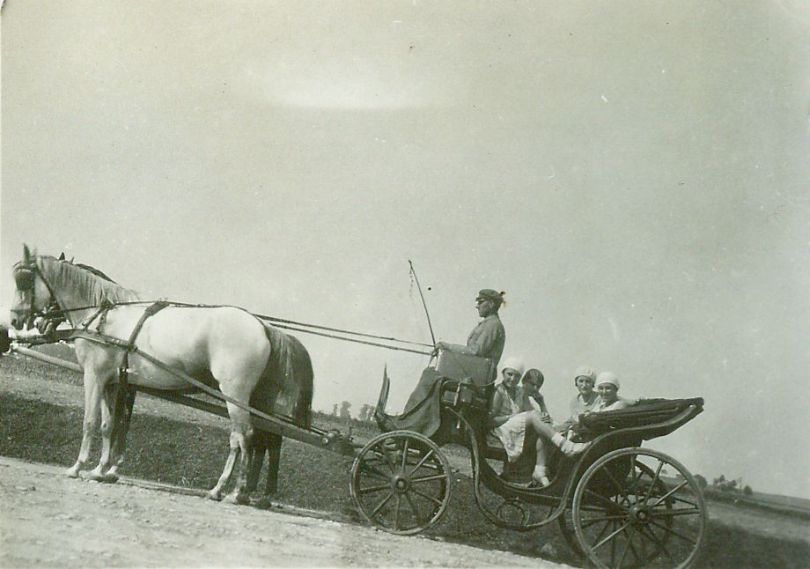 | Nr. inwentarzowy: MŁJ-XVI 1753 / 00 / 063 opis: W drodze do Sobakowa - cztery kobiety w powozie - victorii: siedzenie tyłem do kierunku jazdy, w głębi Janina Kotlińska, bliżej Anna Leska; siedzenie przodem do kierunku jazdy, w głębi Barbara M., bliżej Wanda Leska. Kobiety w jasnych, letnich strojach. Zaprzęg parokonny. lewy koń siwy, szory. Z kozła powozi mężczyzna w marynarce, czapce ze sztywnym daszkiem.data: sierpień 1929 r.czas powstania - daty graniczne: 1929-08-01 - 1929-08-31miejsce: droga między Parzniewicami a Sobakowem (łódzkie)osoby: Janina Kotlińska 1907-1989 („Nina”, "Ninon", córka Kazimierza i Eugenii zd. Grudzińskiej, siostra Edmunda); Anna Leska 1910-1998 ("Anka", później Leska-Daab, podczas II wojny światowej pilot w Wielkiej Brytanii); Barbara M. ("Basia" [Madalińska?, Makólska?]); Wanda Leska 1908-1991 (od 1932 r. Bohdanowicz)tworzywo: papier fotograficzny, błyszczącytechnika: odbitka żelatynowo-srebrowa DOP, czarno-białazespół: album rodziny Bohdanowiczówwymiary (wys. x szer.): 61 x 82 [mm]