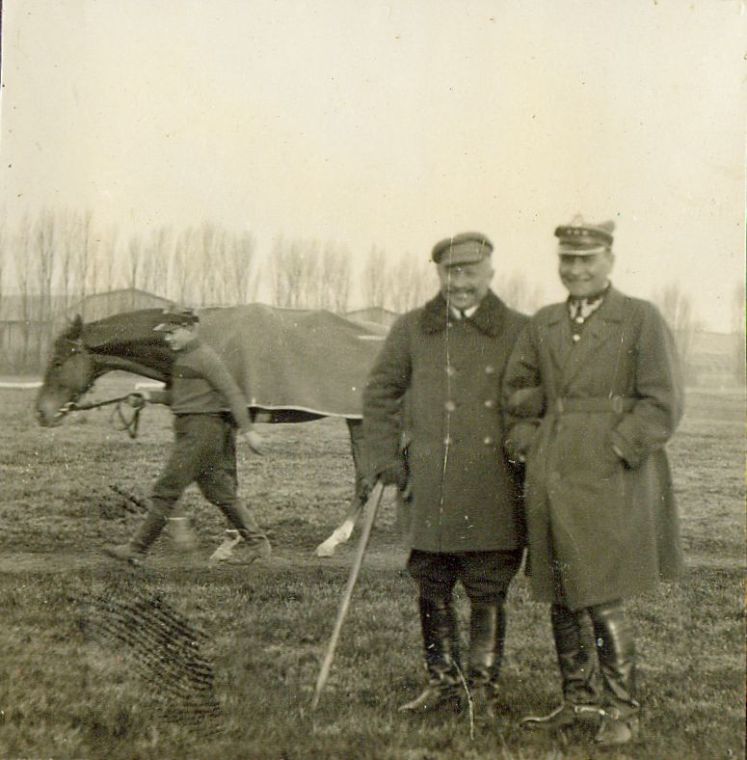 | Nr. inwentarzowy: MŁJ-XVI 1753 / 00 / 123 opis: Na trawie stoją od lewej: rtm. Bronisław Peretiatkowicz (kurtka, kaszkiet, bryczesy, wysokie buty, laska) i rtm. Czesław Nowacki (płaszcz na mundurze). Za nimi młody człowiek prowadzi osiodłanego konia w derce, w tle hangary lotniska mokotowskiego. data: kwiecień 1930 r.czas powstania - daty graniczne: 1930-04-01 - 1930-04-30miejsce: Warszawa, Pole Mokotowskie, tor wyścigów konnychosoby: Rtm. 15 p.u. w st. spocz. Bronisław Adam Peretiatkowicz ur. 1876 (mistrz Polski i Rosji w skoku na wysokość, inspektor toru przy Polnej); rtm. Czesław Nowacki (9 p.s.k., kierownik stajni grona oficerów 9 p.s.k., właściciel własnej stajni, udzielał się w Kole Sportowo-Hodowlanym pow. Szczuczyńskiego w Grajewie).tworzywo: papier fotograficzny, błyszczącytechnika: odbitka żelatynowo-srebrowa DOP, czarno-białazespół: album rodziny Bohdanowiczówwymiary (wys. x szer.): 51 x 50 [mm]