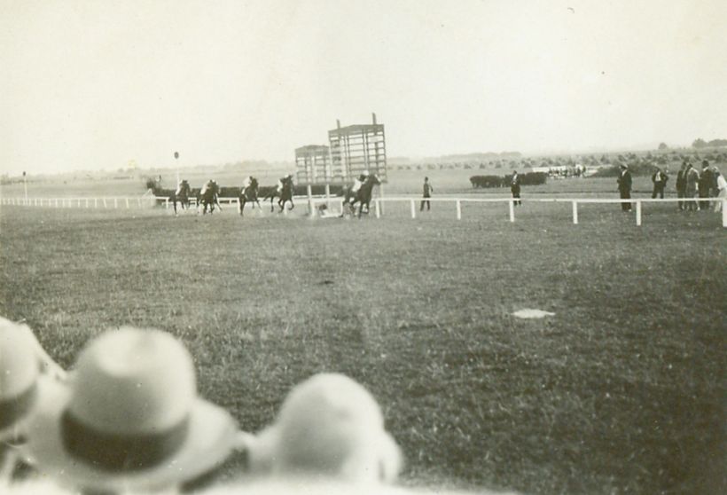 Nr. inwentarzowy: MŁJ-XVI 1753 / 00 / 033 opis: Tor wyścigów konnych, finisz gonitwy - sześć koni na ostatniej prostej. Widać nieostre głowy kibiców na trybunie, ludzi po wewnętrznej stronie bariery (kanatu).data: okres mitingu wyścigowego w Piotrkowieczas powstania - daty graniczne: 1929-08-03 - 1929-08-18miejsce: Piotrkówtworzywo:papier fotograficzny, błyszczącytechnika:odbitka żelatynowo-srebrowa DOP, czarno-białazespół:album rodziny Bohdanowiczówwymiary (wys. x szer.): 60 x 86 [mm]