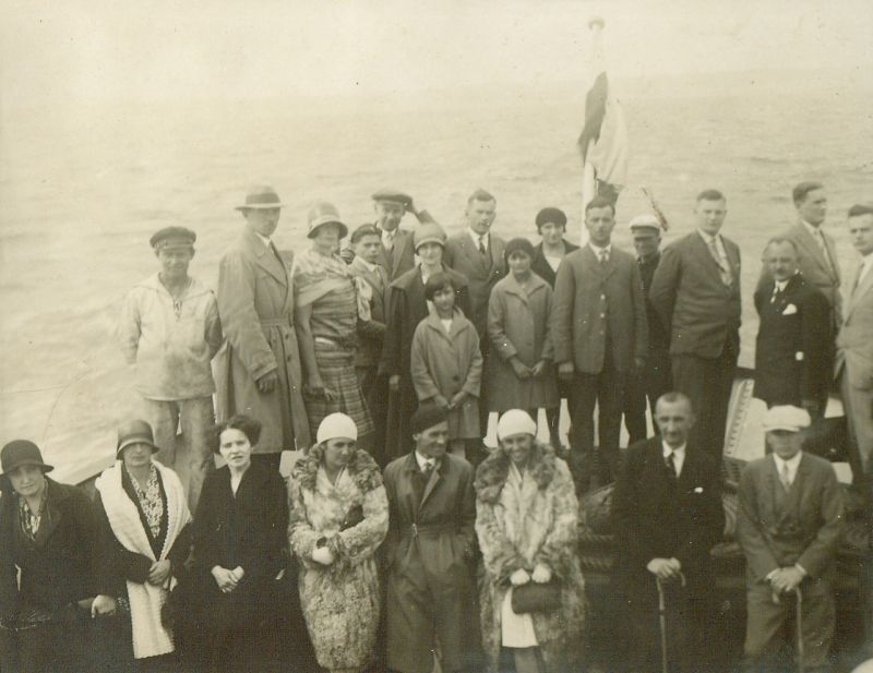 | Nr. inwentarzowy: MŁJ-XVI 1753 / 00 / 028 opis: Rejs po Bałtyku - zbiorowe zdjęcie wycieczkowiczów (24 osoby) na rufie statku. W dolnym rzędzie na środku siostry Leskie (w futrach i jasnych beretach) - z lewej Anna, z prawej Wanda. Między nimi Władysław Zgorzelski w cywilnym stroju (płaszcz, ciemny beret).data: lipiec - sierpień 1929 .czas powstania - daty graniczne: 1929-07-01 - 1929-08-31miejsce: Gdyniaosoby: Anna Leska 1910-98 (Anka, później Leska-Daab); por. Władysław Zgorzelski 1901-1998 Edynburg (15 p.u., jeździec klasy międzynarodowej, po wojnie trener); Wanda Leska 1908-91 (później Bohdanowicz)tworzywo: papier fotograficzny, matowytechnika: odbitka żelatynowo-srebrowa DOP, czarno-białazespół: album rodziny Bohdanowiczówwymiary (wys. x szer.): 86 x 109 [mm]