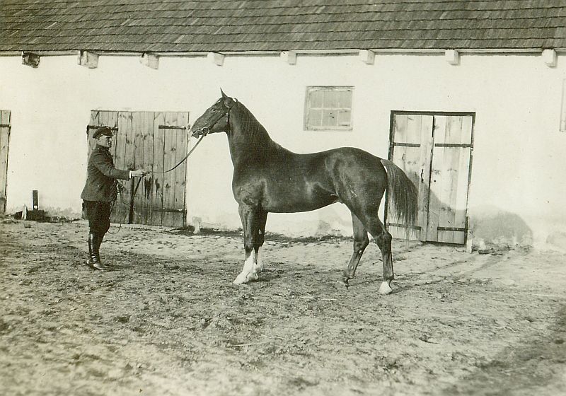 | Nr. inwentarzowy: MŁJ-XVI 1752 / 02 / 014 opis: Przed budynkiem gospodarczym masztalerz w mundurze prezentuje stojącego konia Hanomag. Mężczyzna w czapce z daszkiem, kurtce mundurowej, bryczesach i wysokich butach trzyma za wodze konia w prostym ogłowiu.data: czerwiec 1929czas powstania - daty graniczne: 1929-06-01 - 1929-06-30miejsce: Parzniewice (łódzkie, majątek Kotlińskich, od 1931 r. Wereszczyńskich)tworzywo: papier fotograficzny, błyszczącytechnika: odbitka żelatynowo-srebrowa DOP, czarno-białazespół: album rodziny Bohdanowiczówwymiary (wys. x szer.): 85 x 118 [mm] Koń: 1. Hanomag, maść kasztanowata - koń, który w 1929 r. był w Parzniewicach