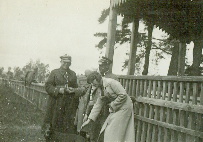 data: czerwiec 1933 r.czas powstania - daty graniczne: 1933-06-01 - 1933-06-30miejsce: Wilno, Pośpieszkaosoby: Mjr Leon Bardach ur. 1891 (od 1925 do 1939 pułkowy lekarz weterynarii w 4 p.u. w Wilnie); rtm. Bronisław Kulik ur. 1897 r. (w l. 30. rotmistrz 4 p.u.); Krystyna Bohdanowicz ("Krysia", córka Jana Bohdanowicza i Marii "Maryni" zd. Cywińskiej, siostra Heleny i Michała).tworzywo: papier fotograficzny, błyszczącytechnika: odbitka żelatynowo-srebrowa DOP, czarno-białazespół: album rodziny Bohdanowiczówwymiary (wys. x szer.): 57 x 82 [mm]