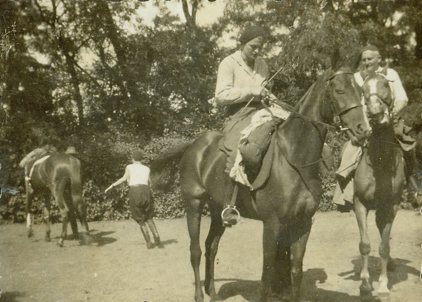 | Nr. inwentarzowy: MŁJ-XVI 1640 / 00 / 001 opis: Rajd Poznań-Gdynia, zorganizowany przez Śląski Klub Jazdy Konnej - pierwszy postój. Plac, z tyłu drzewa, krzewy. Na pierwszym planie K. Dobrogoyska konno, obok St. Grabianowski konno, w głębi R. Brökere podążająca za osiodłanym wierzchowcem. Do siodeł przytroczone koce, płaszcze. Letnie, swobodne stroje.data: podano początkową i końcową datę rajduczas powstania - daty graniczne: 1933-08-03 - 1933-08-28miejsce: Łubowice (na płn.-wsch. od Poznania)osoby: Romana (Roma) Brökere (1909-2001, później Daszkowska), Krystyna Dobrogoyska (1902-1975), inż. Stanisław Grabianowski (1889-1957, szef wyprawy)tworzywo: papier fotograficzny, błyszczącytechnika: odbitka żelatynowo-srebrowa DOP, czarno-białazespół: album rodziny Brökerewymiary (wys. x szer.): 53 x 72 [mm]