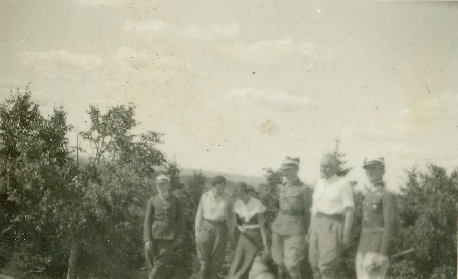 | Nr. inwentarzowy: MŁJ-XVI 1640 / 00 / 010 opis: Rajd Poznań-Gdynia, zorganizowany przez Śląski Klub Jazdy Konnej. W gościnie w 8 Pułku Strzelców Konnych. Na tle krzewów stoją ustawieni do zdjęcia: oficer, K. Dobrogoyska, kobieta w kapeluszu (głaszcze psa), oficer, St. Grabianowski, oficer. Wojskowi w mundurach, cywile w letnich strojach - uczestnicy rajdu jeździeckich.data: podano początkową i końcową datę rajduczas powstania - daty graniczne: 1933-08-03 - 1933-08-28miejsce: Chełmnoosoby: Krystyna Dobrogoyska (1902-1975), inż. Stanisław Grabianowski (1889-1957, szef wyprawy), oficerowie 8 Pułku Strzelców Konnychtworzywo: papier fotograficzny, błyszczącytechnika: odbitka żelatynowo-srebrowa DOP, czarno-białazespół: album rodziny Brökerewymiary (wys. x szer.): 46 x 69 [mm]