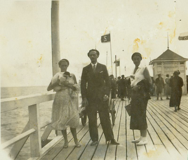| Nr. inwentarzowy: MŁJ-XVI 1640 / 00 / 041 opis: Rajd Poznań-Gdynia, zorganizowany przez Śląski Klub Jazdy Konnej. Gdyńskie molo, przy barierce stoją: R. Brökere (jasna sukienka, beret, piesek na rękach), mężczyzna (ciemny garnitur, beret), K. Dobrogoyska (ciemna spódnica, jasna bluzka bez rękawów, beret). Widać ażurowe deskowanie, wieżyczkę z napisem Żegluga Polska.data: podano początkową i końcową datę rajduczas powstania - daty graniczne: 1933-08-03 - 1933-08-28miejsce: Gdynia - Orłowo, moloosoby: Romana (Roma) Brökere(1909-2001, później Daszkowska), Krystyna Dobrogoyska (1902-1975)tworzywo: papier fotograficzny, błyszczącytechnika: odbitka żelatynowo-srebrowa DOP, czarno-białazespół: album rodziny Brökerewymiary (wys. x szer.): 62 x 71 [mm]
