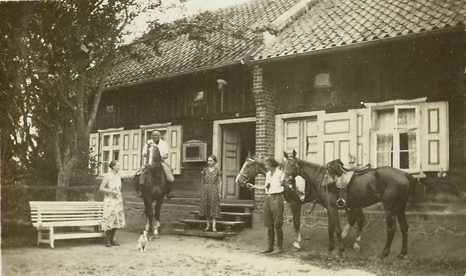 | Nr. inwentarzowy: MŁJ-XVI 1640 / 00 / 024 opis: Rajd Poznań-Gdynia, zorganizowany przez Śląski Klub Jazdy Konnej - popas w Zajączkowie. Przed drewnianym domem z jasnymi okiennicami stoją: kobieta, St. Grabianowski (na koniu), kobieta, K. Dobrogoyska trzymająca 2 konie. Przed domem drzewa, jasna ławka i mały piesek.data: podano początkową i końcową datę rajduczas powstania - daty graniczne: 1933-08-03 - 1933-08-28miejsce: Wielkie Zajączkowo (na północ od Grudziądza)osoby: inż. Stanisław Grabianowski (1889-1957, szef wyprawy, Krystyna Dobrogoyska (1902-1975)tworzywo: papier fotograficzny, błyszczącytechnika: odbitka żelatynowo-srebrowa DOP, czarno-białazespół: album rodziny Brökerewymiary (wys. x szer.): 46 x 70 [mm]